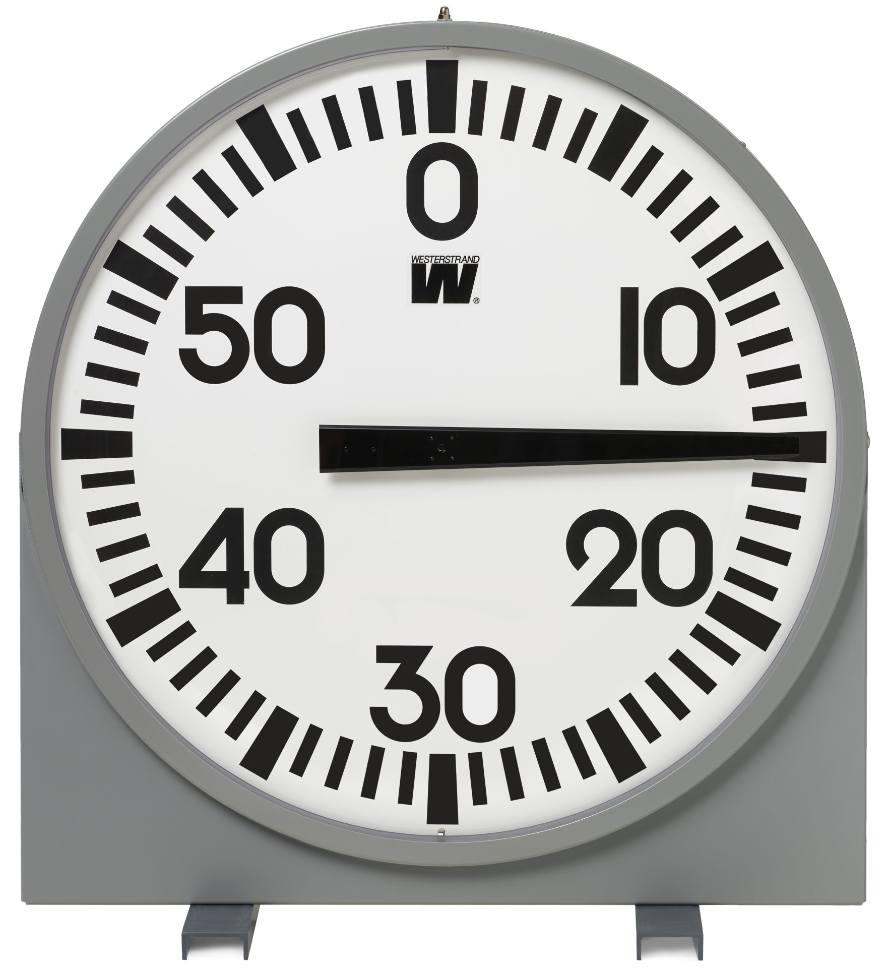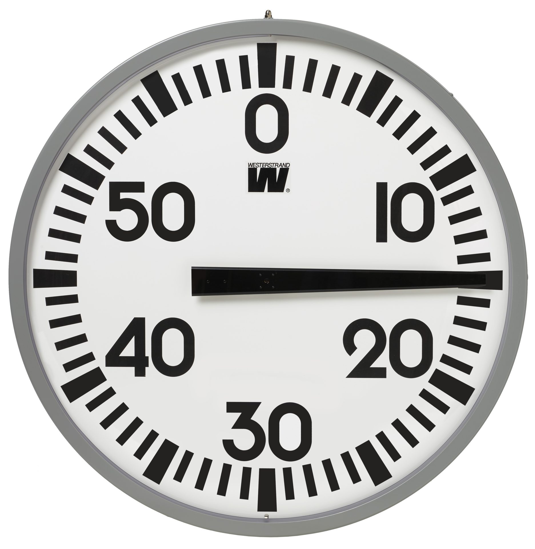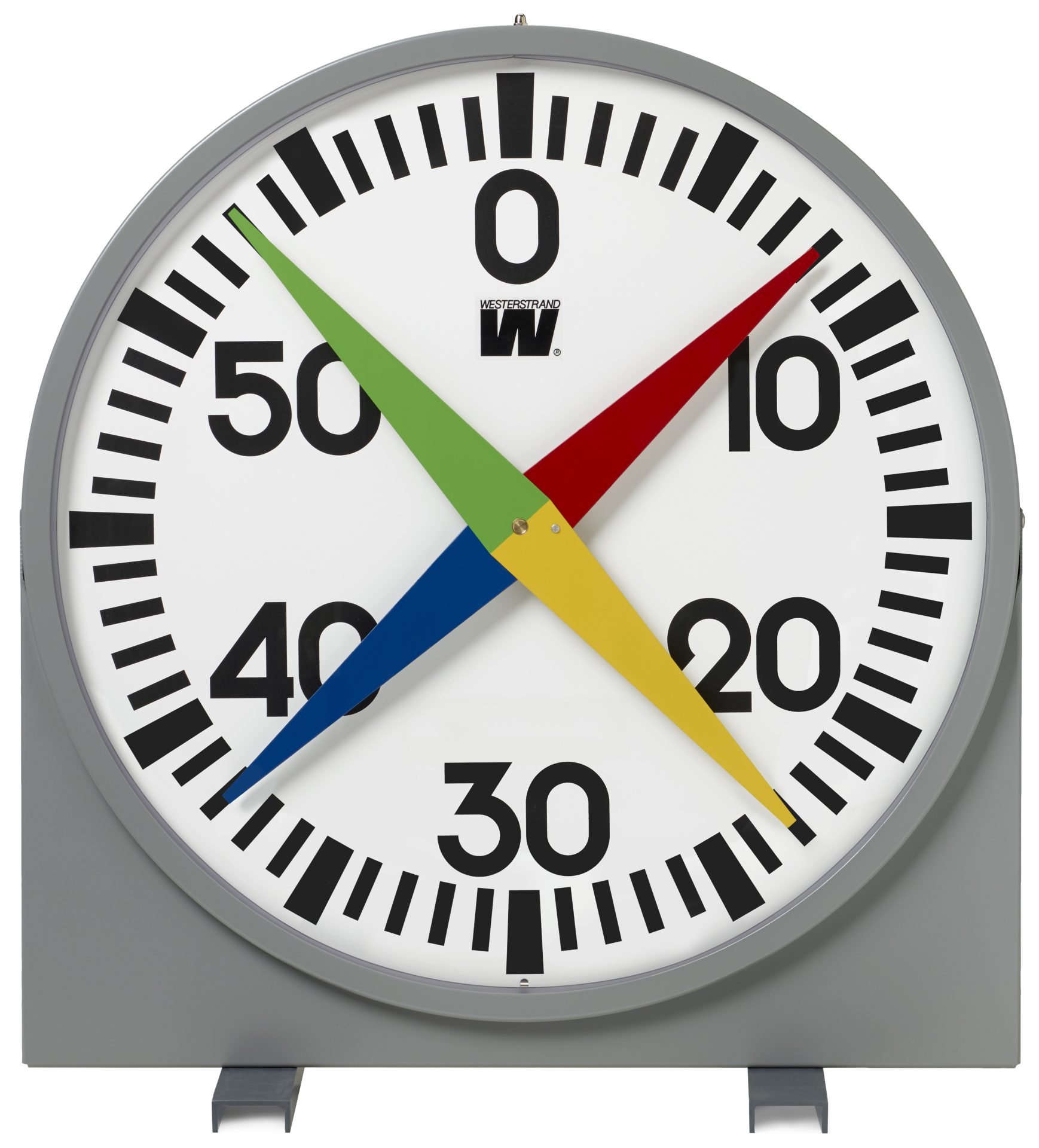 Single-sided pace clock suitable for damp environments such as indoor pools etc. The dial face is painted white with black numerals and characters. It has a black minute hand or four hands in red, yellow, blue and green.