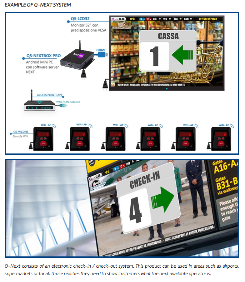The main unit of this product resides in the QS-NEXTBOX and requires a monitor, a TV or a device that has an HDMI input and possibly a speaker to reproduce audio. Furthermore, QS-NEXTBOX needs one LAN connection for the management of call consoles (virtual or physical) and if it were an Internet connection is also available and is able to show the weather forecasts and / or last-minute news via RSS FEED.