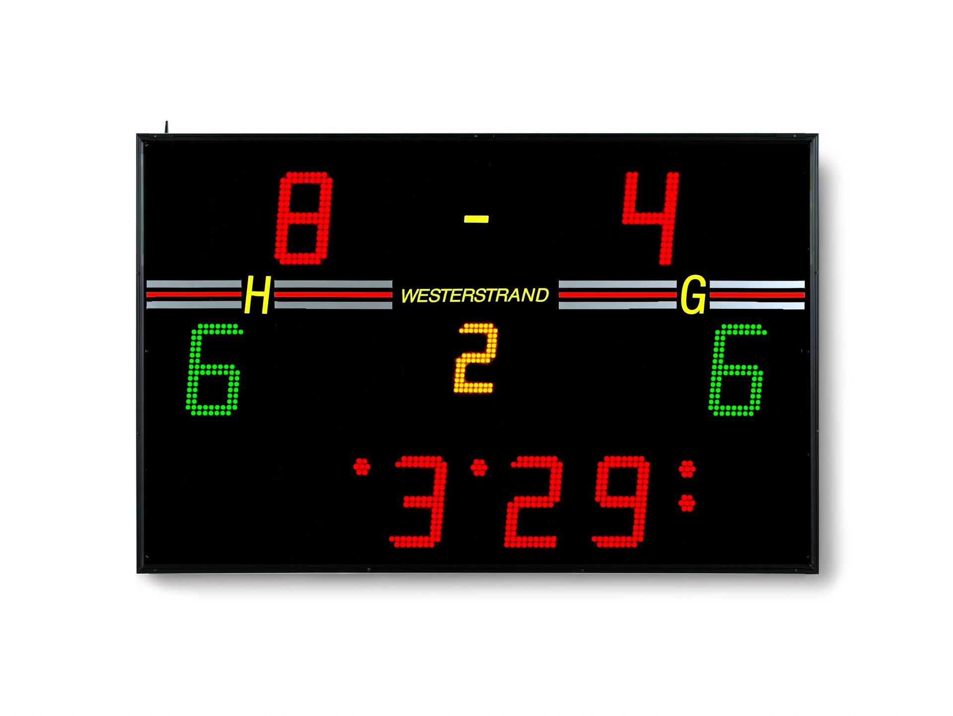 Scoreboard with integrated siren and LED digits in SMD technology.