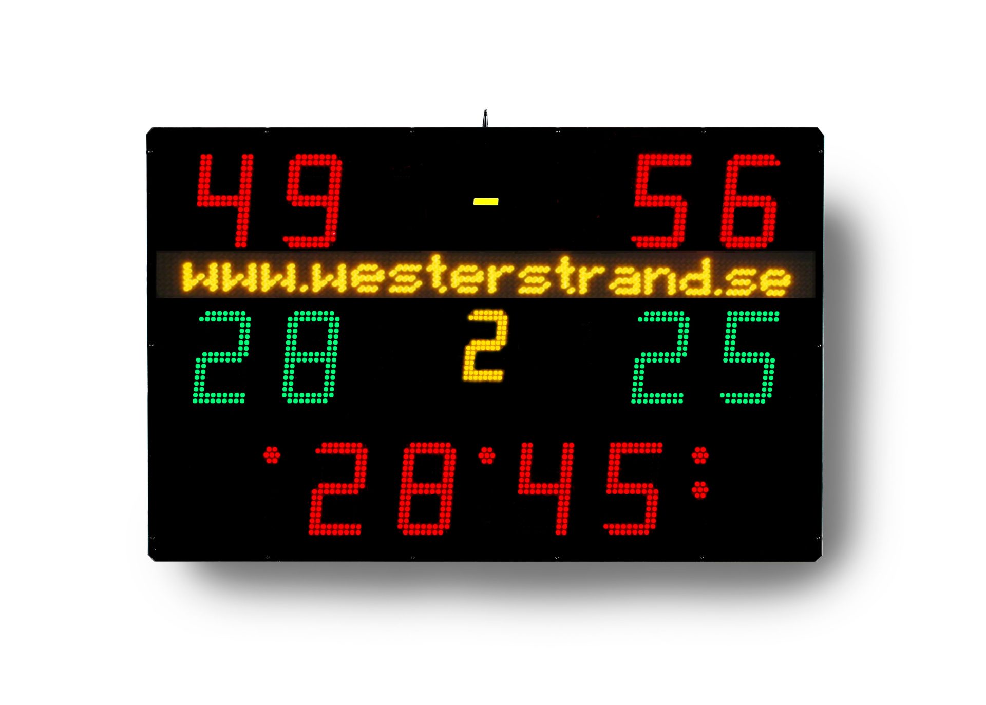 Scoreboard with integrated siren and LED digits in SMD technology. The design makes it suitable for most indoor sports.