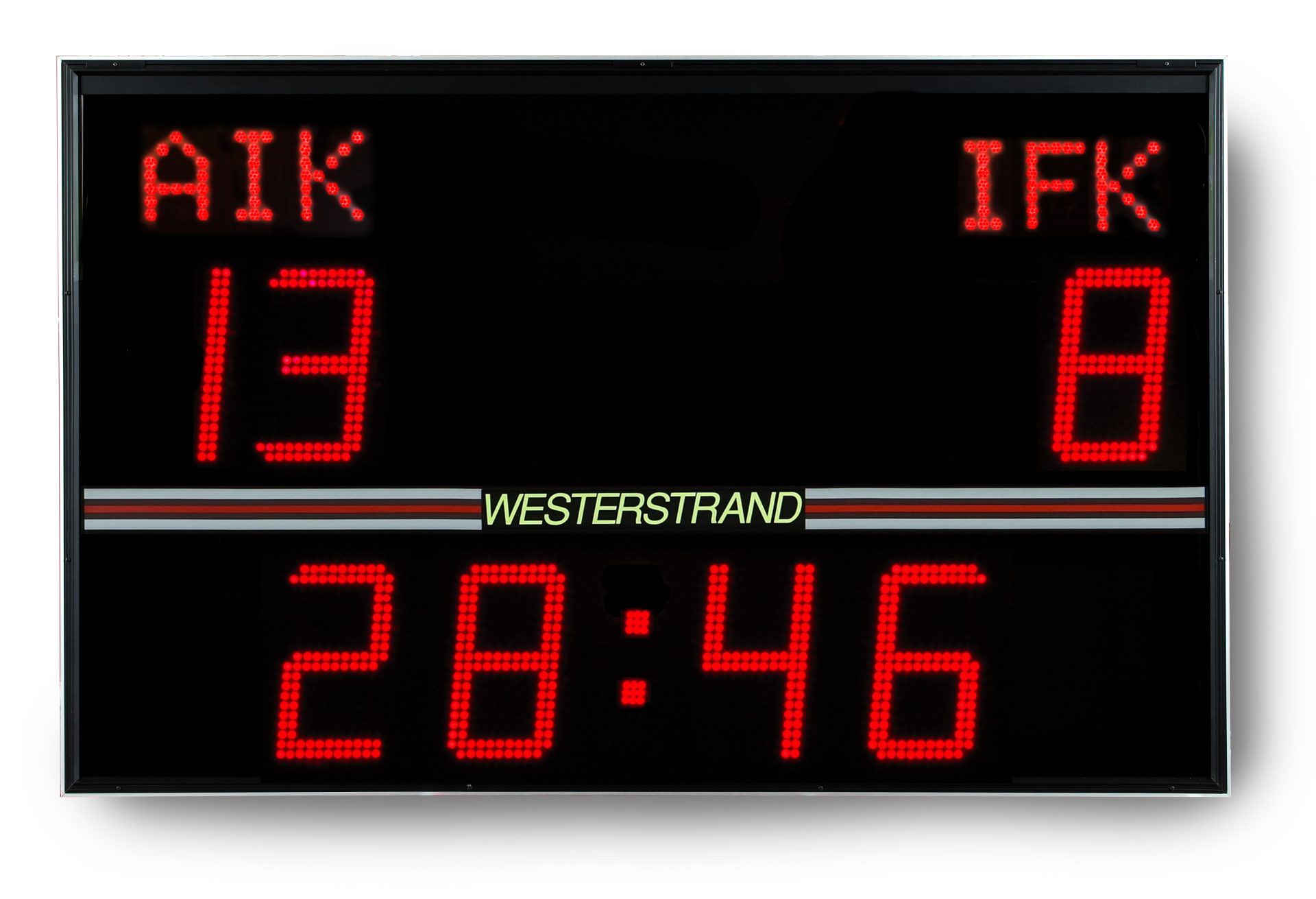 Scoreboard with LED digits in SMD technology. Its design makes it suitable for e.g. soccer and bandy.